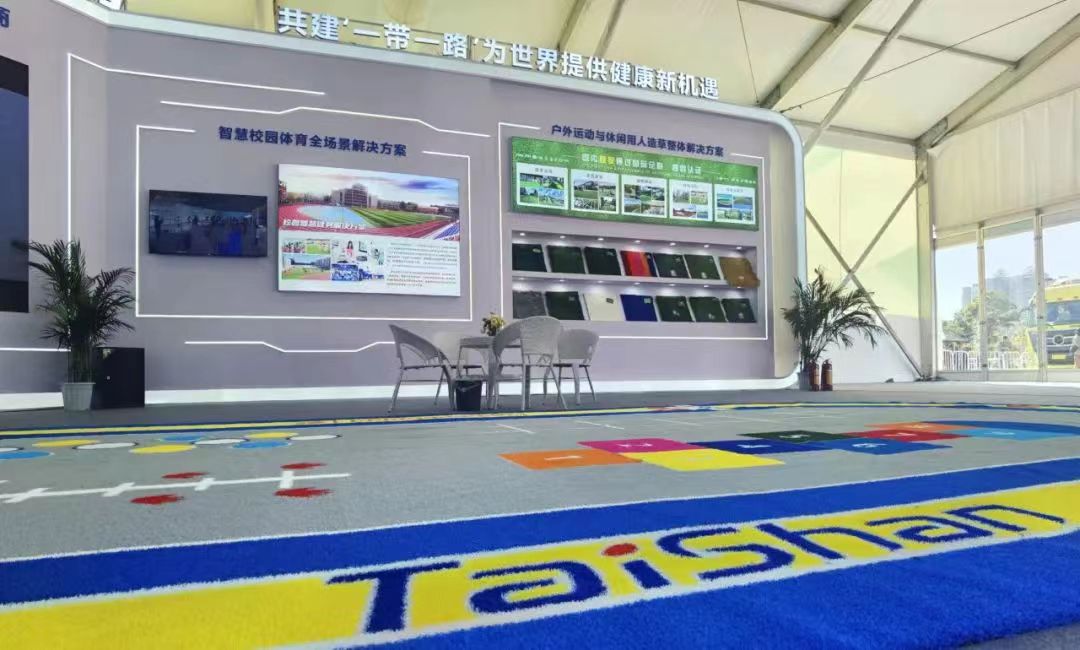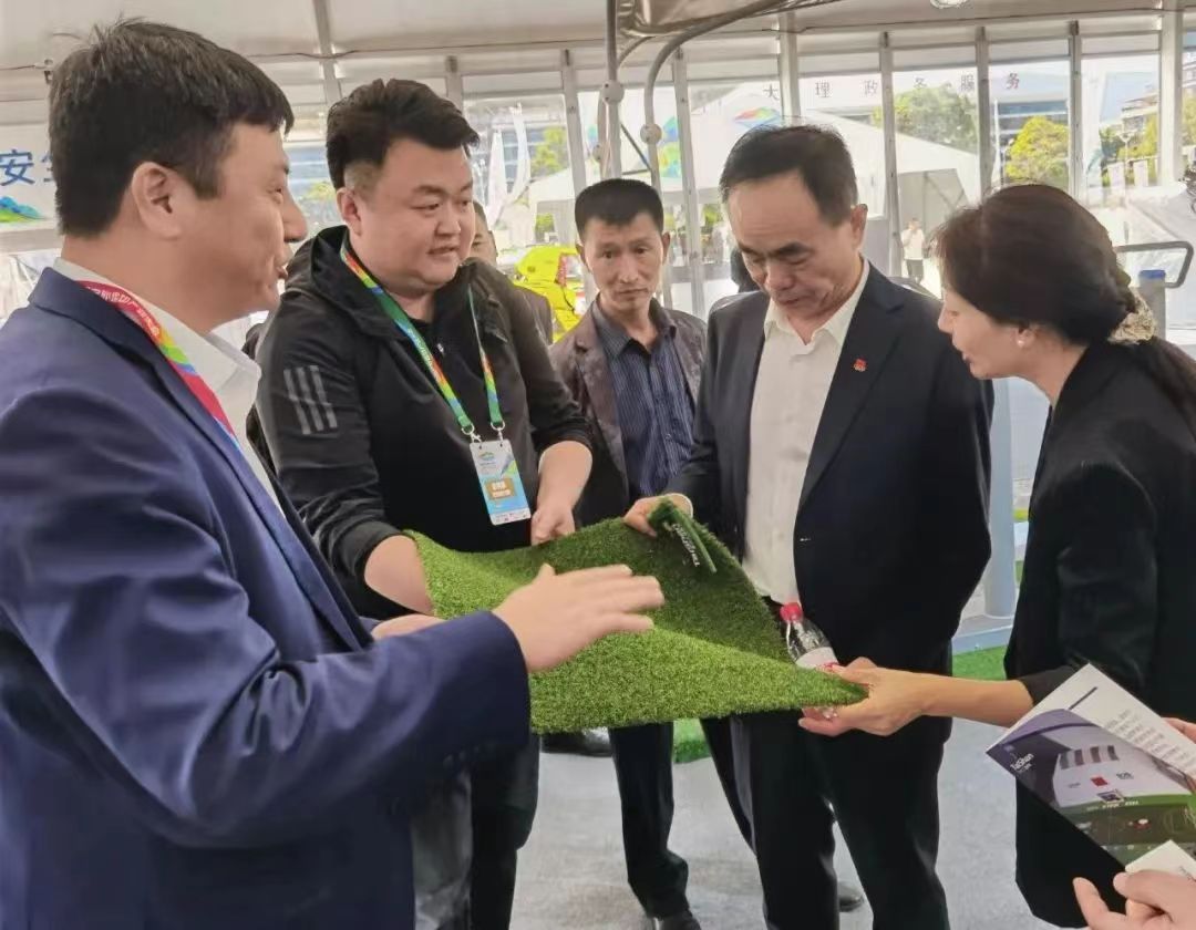 3003新葡的京体育携户外运动与休闲人造草整体解决方案亮相会场。作为国内首家通过足联、曲联双认证的企业可根据不同用户的户外运动需求,生产多种类型的户外运动草坪。