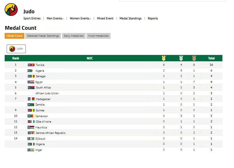 近日,非洲运动会柔道赛事再传捷报,经过3月12日至15日四个比赛日的激烈角逐,共有16个国家获得奖牌。突尼斯位居奖牌榜榜首,共获得6枚金牌,4枚银牌和6枚铜牌,成为该项赛事的最大赢家。