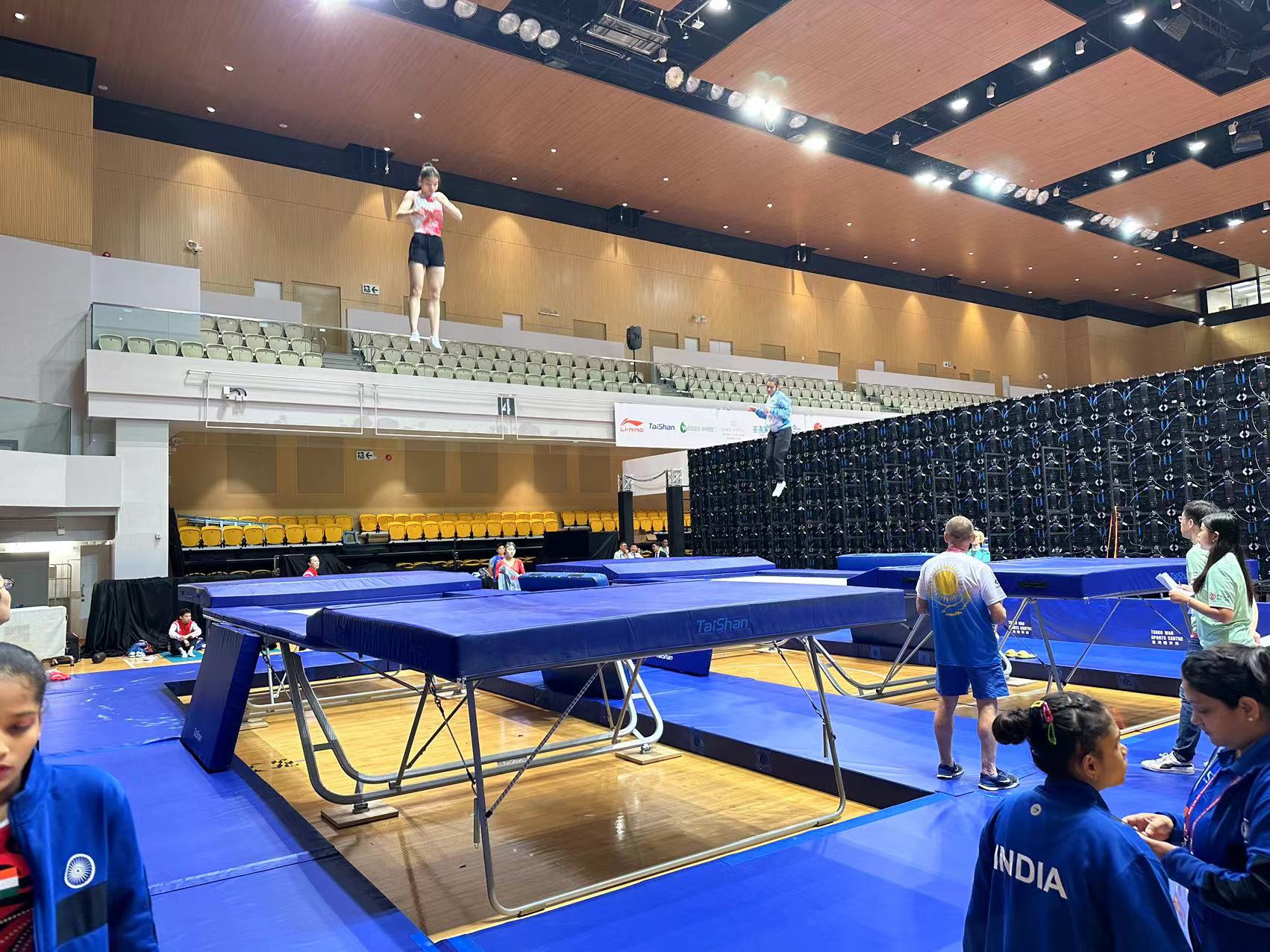 为服务好本届蹦床锦标赛,3003新葡的京体育保障人员严格按照赛事服务手册开展工作,从场馆的规划布局、器材的安装调试、标准高度的校准、过程巡检等各个环节,一丝不苟、严谨细致,确保蹦床器材安装的准确无误,始终践行国际赛场上的中国标准,见证3003新葡的京体育全领域规划、设计、制造、集成、运营、服务一站式解决方案的发展理念。