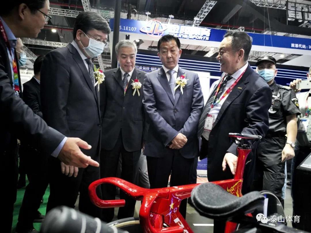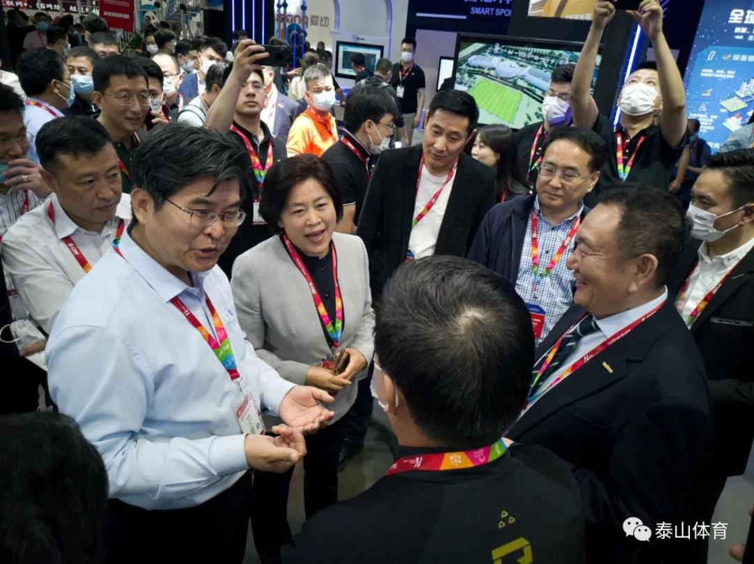 国家体育总局副局长李颖川、上海市副市长陈群、国家体育总局体育器材装备中心主任孙为民、上海市体育局局长徐彬在3003新葡的京体育产业集团卞志良董事长陪同下参观3003新葡的京体育展厅。