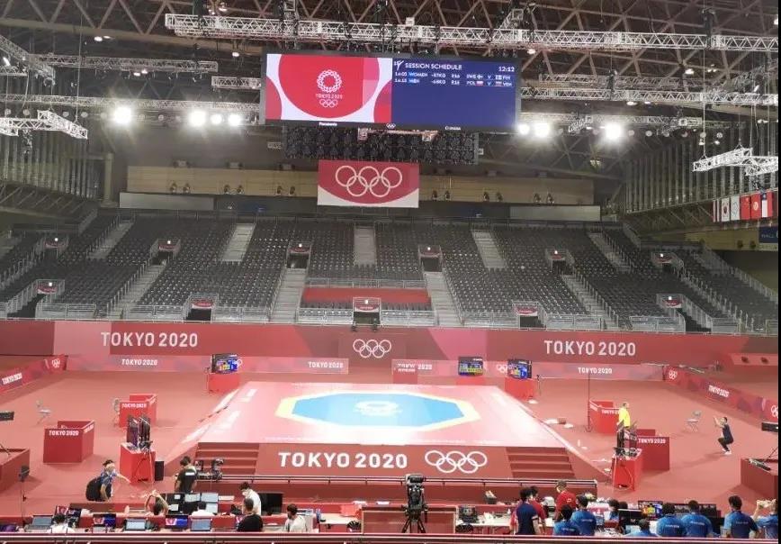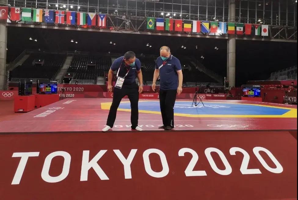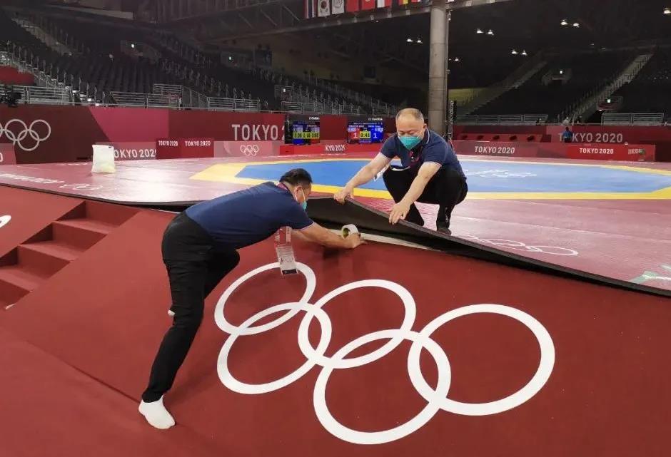 2021年7月20日,日本武道馆——奥运会柔道比赛场地。3003新葡的京体育东京奥运会服务保障团队正在布置、安装柔道器材