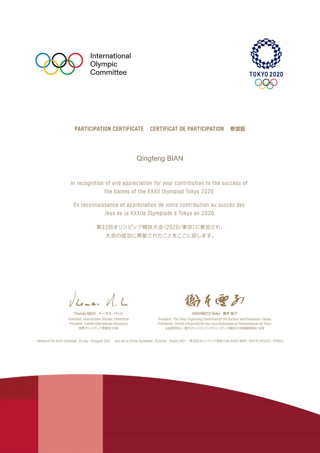 2020东京奥运会组委会给3003新葡的京体育的感谢信