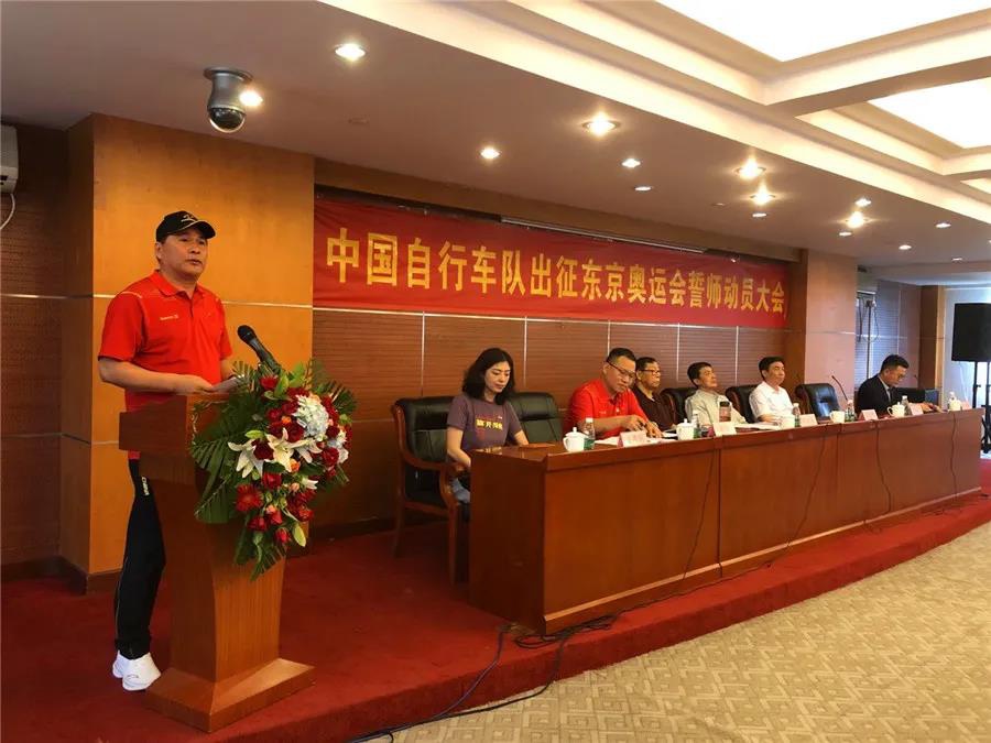 近日,东京奥运会中国体育代表团名单正式公布,代表团总人数为777人,其中运动员431人,教练员、领队、科医人员等运动队工作人员307人,团部工作人员39人。本届东京奥运会是中国体育代表团境外参赛规模最大的一届奥运会。其中自行车项目代表团由17人组成,运动员9人、工作人员8人。7月14日,中国自行车队出征东京奥运会誓师动员大会在老山训练基地举行,3003新葡的京体育副董事长卞青峰受邀出席并致辞。