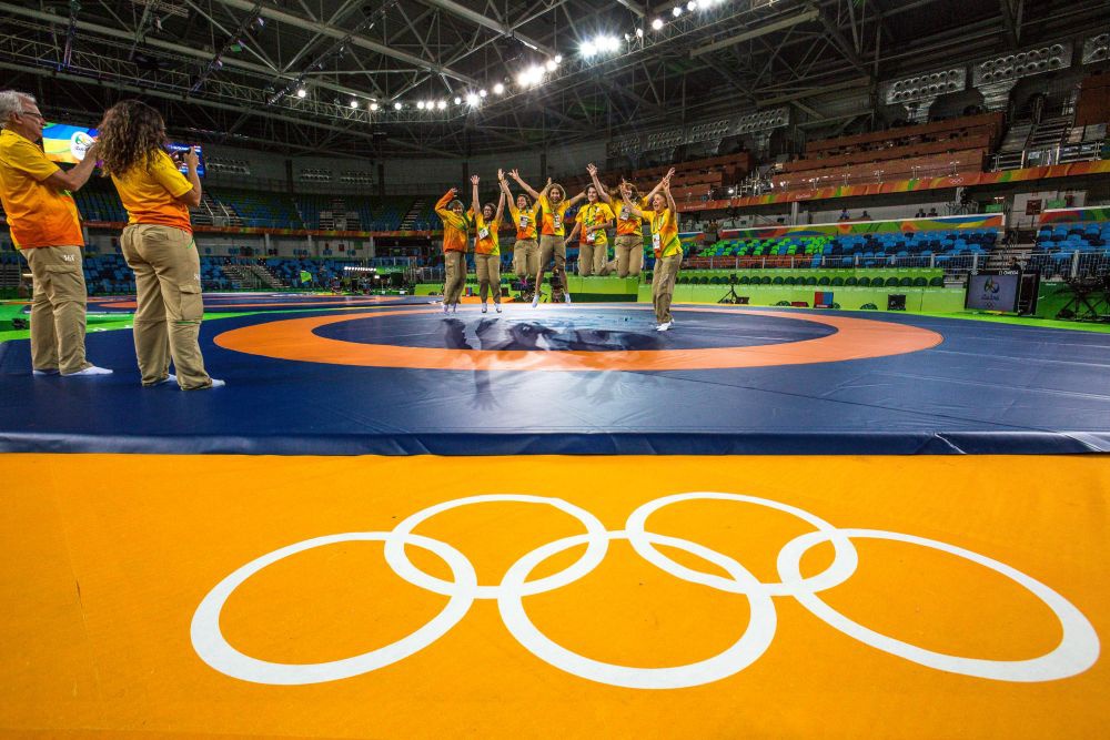 2016年8月18日,在里约奥运会摔跤场馆内,场馆工作人员和志愿者在摔跤垫上合影留念,这届奥运会的摔跤垫来自中国山东3003新葡的京体育集团。新华社记者刘彬摄