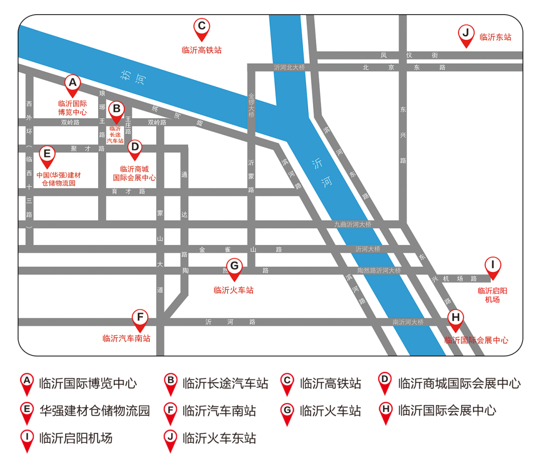 公交路线:路临沂机场乘坐K36→长途汽车站换乘中心转K82路→临沂国际博览中心
