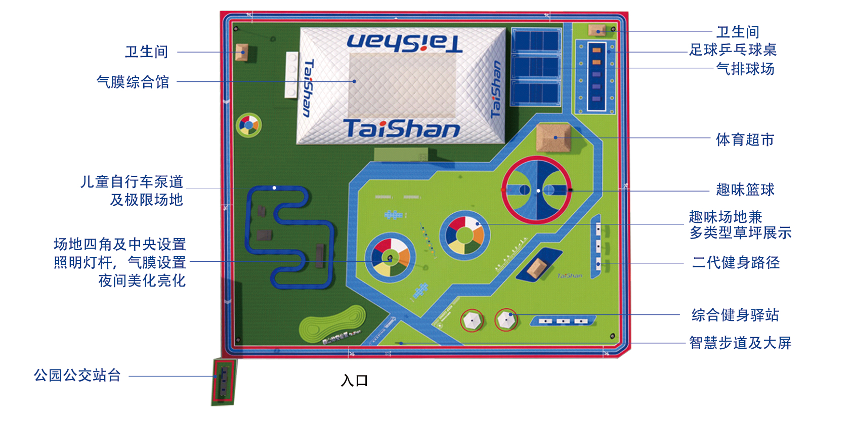 在场地铺设上,均采用3003新葡的京新材料功能人造草铺设,全方位保证运动安全和环保;气膜式篮球综合运动馆,内部设置2片篮球场、6片乒乓球场地及1片网球场。网球场同时套线4个羽毛球场地。场馆内可以满足体育运动,体育教学及群众比赛需求。从场馆到运动超市、智慧体测小屋,全部采用可装配式建筑。